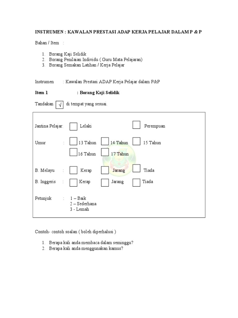 Borang Kaji Selidik Adab Pelajar Pdf